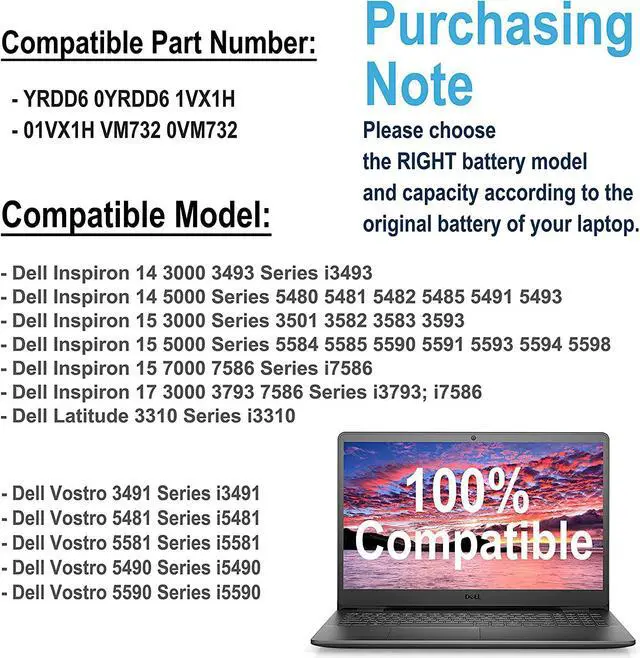 Burflo YRDD6 Battery for Dell Inspiron / Latitude / Vostro Perfect for 3493 3501 3583 3593 3793 5481 5485 5491 5584 5593 3310 559 High Capacity Cells:The BURFLO 11.4V 42Wh Battery is sepecially designed for your Dell laptop < Dell Inspiron 14 15 17 3493 3501 5480 5481 5482 5485 5491 5493 3582 3583 3593 5584>.The high capacity powers your dell laptop and you can easily and quickly recharge it.