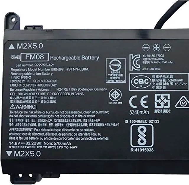1.Battery Type: Rechargeable Li-Ion Battery 2.Model: Fm08 3.Voltage: 14.6V 4.Capatity: 83.22Wh 5700Mah 5.Connector: Please Refer To The Picture And Check It. 6.Certificate: Ce,Rohs,Fcc,100% New From Manufacturer, Grade A Cell 7.Worry-Free Warranty: At , We Believe In Our Battery. Thats Why We Back Them All With An 12-Month Warranty And Provide Friendly Customer Service, Easy-To-Reach Support. 8.Replacement For Part Number: Fm08 Tpn-Q195 922752-421 922753-421 922976-855 922977-855 920070-855 Hstnn-Lb8b Hstnn-Lb8a 9.Compatible Models (Use "Ctrl+F To Find Your Model Quickly") Fit For Hp Omen 17-An1xx 17-An1xxx 17T-An000 17T-An100 Fit For Hp Omen 17-An001ca 17-An001la 17-An010ca 17-An011dx 17-An100ca 17-An110nr Fit For Hp Omen 17-An006tx 17-An026tx 17-An027tx 17-An028tx 17-An032tx 17-An033tx Fit For Hp Omen 17-An034tx 17-An035tx 17-An036tx 17-An037tx 17-An038tx 17-An039tx Fit For Hp Omen 17-An040tx 17-An041tx 17-An042tx 17-An043tx 17-An044tx 17-An045tx Fit For Hp Omen 17-An046tx 17-An047tx 17-An048tx 17-An049tx 17-An050tx 17-An051tx Fit For Hp Omen 17-An070tx 17-An074tx 17-An086tx 17-An102tx 17-An105tx 17-An137tx Fit For Hp Omen 17-An141tx 17-An144tx 17-An149tx 17-An150tx Not All Models Are Listed,Please Check The Part Number Of Your Original Battery. 10.Package Included: 1X Fm08/12-Pin Battery. 11.For Optimal Use Battery: ?Discharge The New Battery To 5% (Not 0%), Then Charge And Cycle 3-4 Times To Wake Up The New Battery. ?The Important Point Is To Perform A Full Discharge Charge Every Other Month To Extend Battery Life. ?Dont Connect Adapter For A Long Time While Using The Battery. It May Damage The Battery. ?Avoid Artificial Shocks, Disassembly, Crush Or Puncture. Do Not Dispose Of In Fire Or Water.