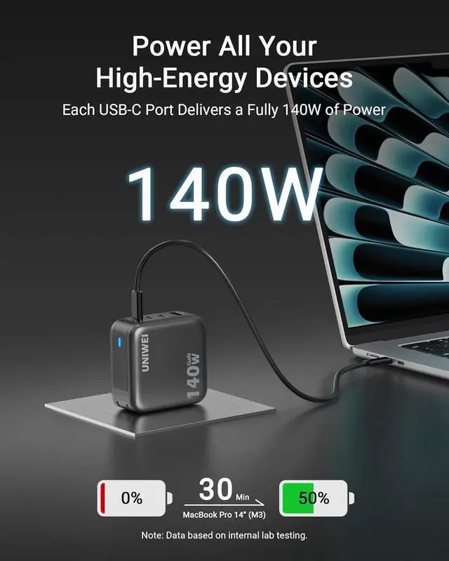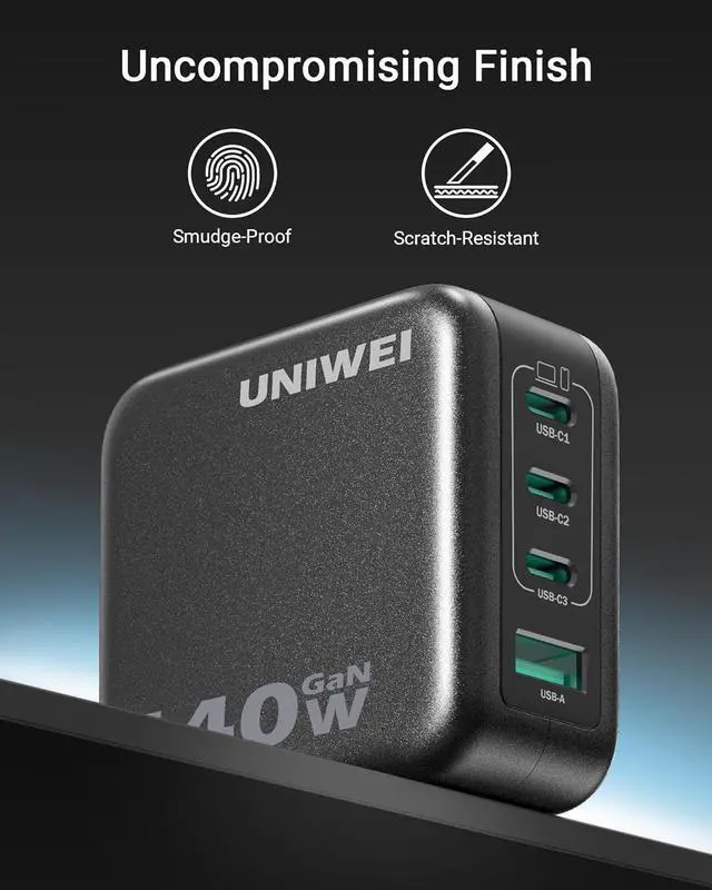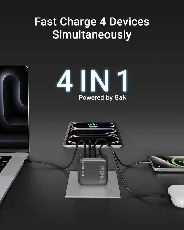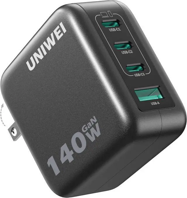 1140W Fast Charging2Portable Design3Fast Charge Two Laptops4Real-Time Protection5Wide Compatibility Model NumberA1631Product NameUNIWEI Kuafu Charger (140W, 4-Port, PD 3.1 )Total Wattage140W MaxInput100-240V, 50 / 60Hz, 1.8A MaxOutput (One Port in Use) USB-C 1: 9 V3A / 15V3A / 20V5A / 28V5A (140W Max); USB-C 2: 9 V3A / 15V3A / 20V5A / 28V5A (140W Max); USB-C 3: 9 V3A / 15V3A / 20V5A / 28V5A (140W Max);
