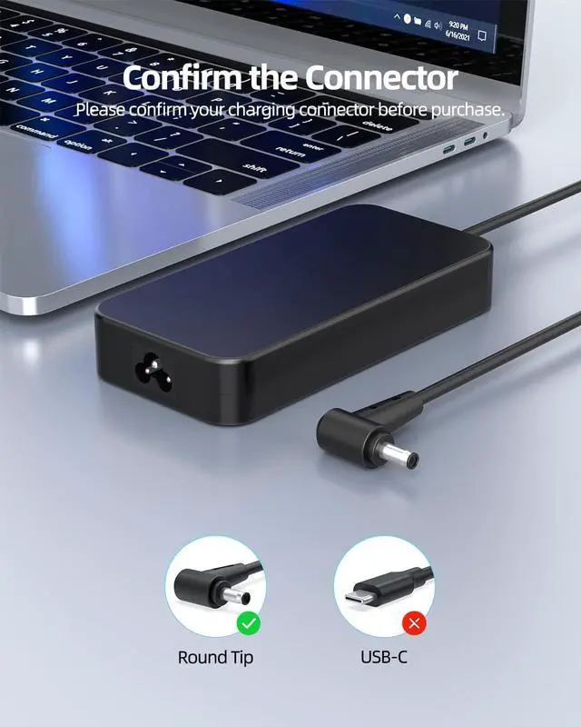 1. Please check the size of the DC connector of the original charger and wattage (Output :xx V - xx A).