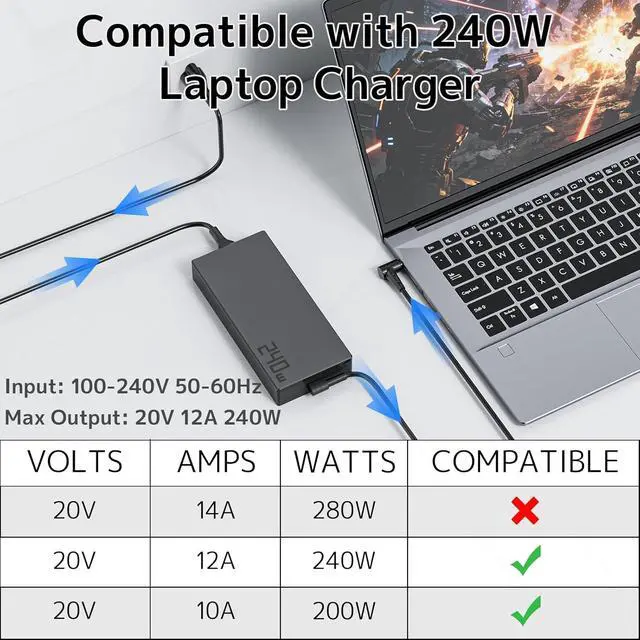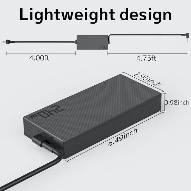 1.POWER PARAMETERS: Input: 100-240V, 50-60Hz 3.5A. Output: 20V 12A 240W. Max Power: 240W. Connector Type: 6.0x3.7mm Round Tip (Also compatible with Asus 230W 200W 180W AC Adapter Charger)