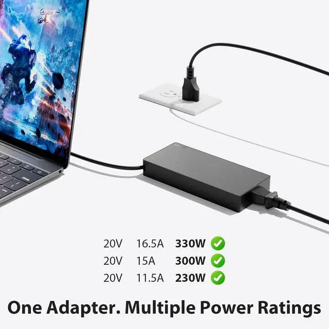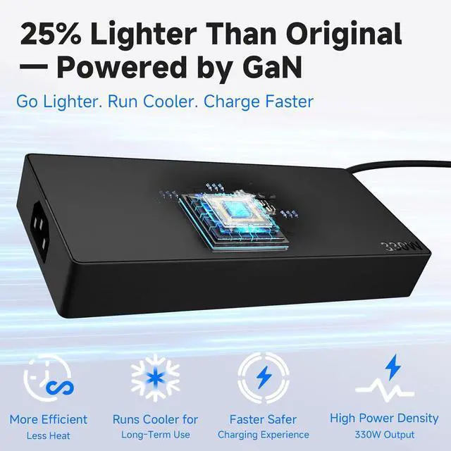 Compact & Durable GaN Design Next-gen GaN components ensure lighter weight and better heat performance. Ideal as a travel-ready upgrade or replacement for your 330W or 300W/230W adapter.