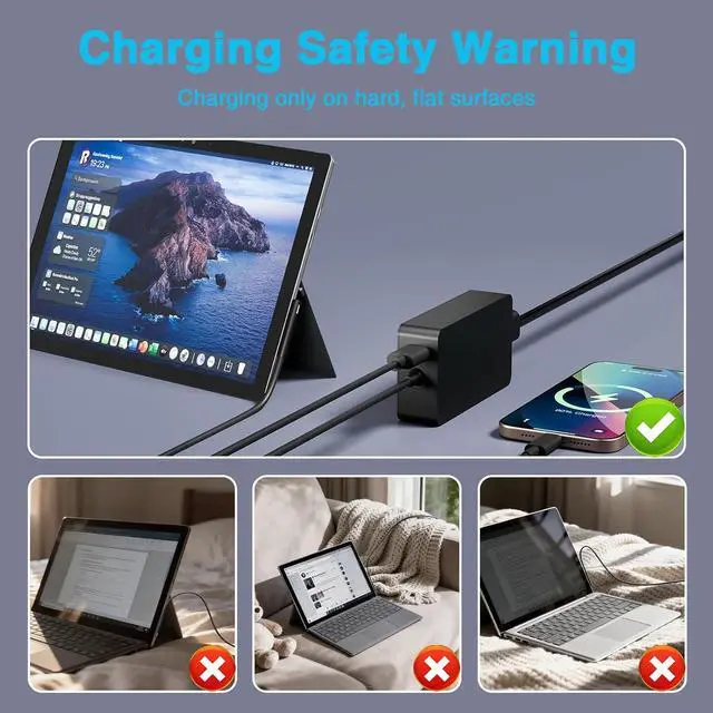 Fast Charging: thanks to a 127W max output, it can intelligently output 127W, 102W, 65W, 44W, 39W, 36W, 24W according to your laptop and provide higher charging performance at the mean time, battery level increase even while playing, with a USB port simultaneous charging your Surface and cellphone