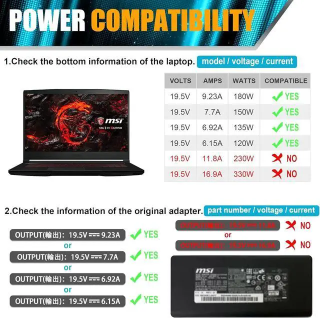 180W 19.5V 9.23A Charger for MSI laptops in need of Size :5.5 mmx2.5mm plug tip Note that the interface is consistent); Power charger compatible for MSI laptops in need of 19.5V 6.15A 120W, 19.5V 6.92A 135W or 19.5V 7.7A 150W power(NOTE:Not for Acer Predator Helios 300 gaming laptops nor for Dell laptops,NOT a 19.5V 11.8A 230W charger)