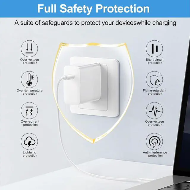Comprehensive Safety Features: Your safety is our top priority. The MacBook Pro charger includes over-current, over-voltage, short circuit, temperature control, and leakage protection. During operation, the charger's temperature is kept below 125.6°F (52°C), ensuring it stays cool under normal use and prevents overheating, keeping both your devices and the charger safe.