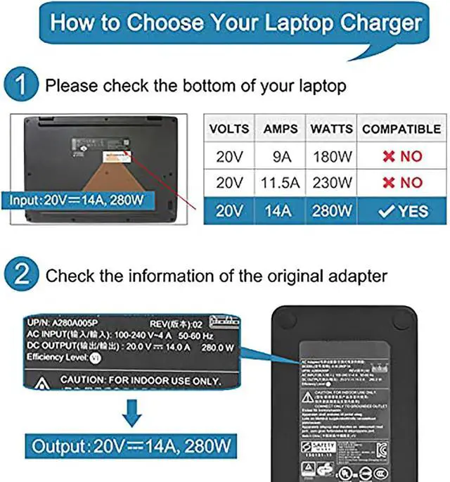 Input: 100-240V ~ 4.4A 50-60Hz, Output: 20V 14A 280W , JUYOON 280W Charger Compatible with MSI MSI 957-1451XP-104 957-1541XP-101 A18-280P1A ADP-280BB B charger