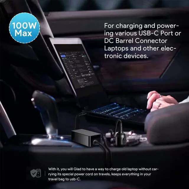 Superior Safety & 100W Super Fast ChargerBuilt-In InnerShield provides absolute protection for your device from over-current, over-power, over-voltage, over-temperature, and short-circuiting. Its PC exterior is shockproof and flame-retardant, offering you top safety.USB C Car charger has a high charging efficiency of up to 96%, the charger can fully charge most laptops in about 1 hour and 30 minu