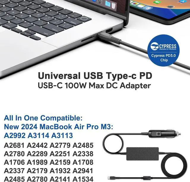 Perfect CompatibilityHKY's new PD 100W USB Type-C DC Car Charger Travel Adapter adopts Cypress PD3.0 chip and is perfectly compatible with 100W 96W 90W 87W 67W 65W 61W 45W 30W 20W 18W 15W MacBook/mainstream laptop brand computers/tablets/smart phones and and other USB TYPE-C Port electronic mobile terminal equipment. Automatic identify your devices and maximizes charging efficiency.Fast charges your smartphone(5V),tablet (15V),and laptop(20V) with USB-C output.