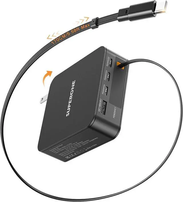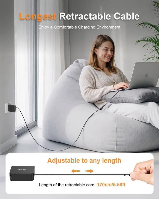 170cm Ultra-Long Retractable Cable: Tired of packing messy charging cables separately for your laptop? Our retractable charger is different because it comes with a 5.58ft (1.7m) retractable USB-C cable. Simply pull out the cable for easy charging in any situation and retract with a gentle pull when finished. It permanently eliminates the worries of carrying, losing or untying loose cables, allowing you to say goodbye to messy cables and enjoy a neat and convenient charging experience anytime, anywhere.