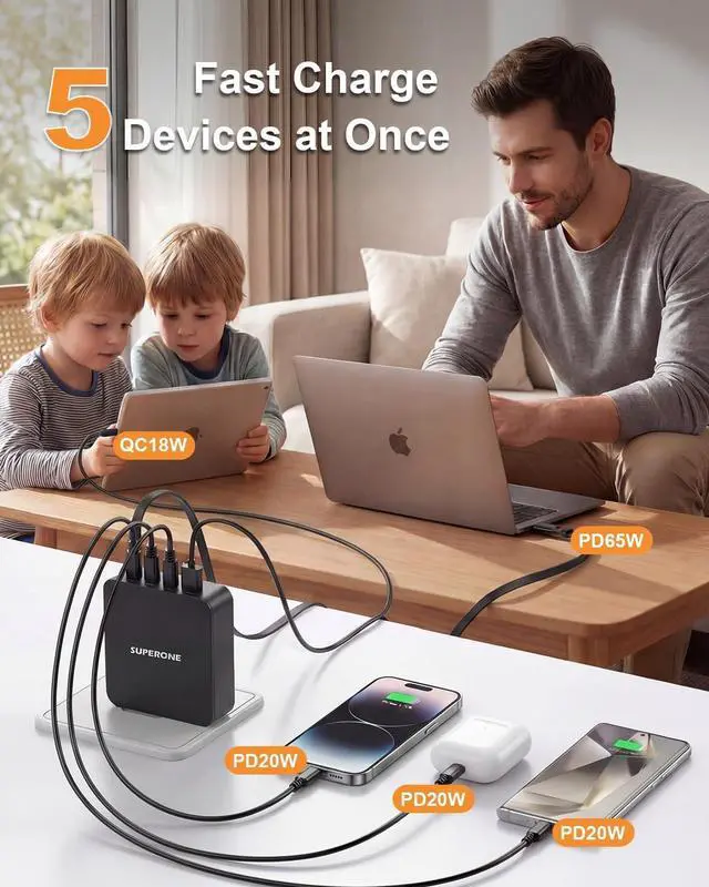 5-in-1 65W Fast Charger: One macbook charger can charge all your devices. This macbook charger usb c comes with a 65W USB-C retractable cable, which can charge your MacBook M4 to 50% in just 30 minutes. In addition, it features three USB-C ports and one USB-B port, allowing you to efficiently power multiple devices simultaneously, such as mobile phones, wireless mice, and headphones, improving your charging efficiency and simplifying your life.
