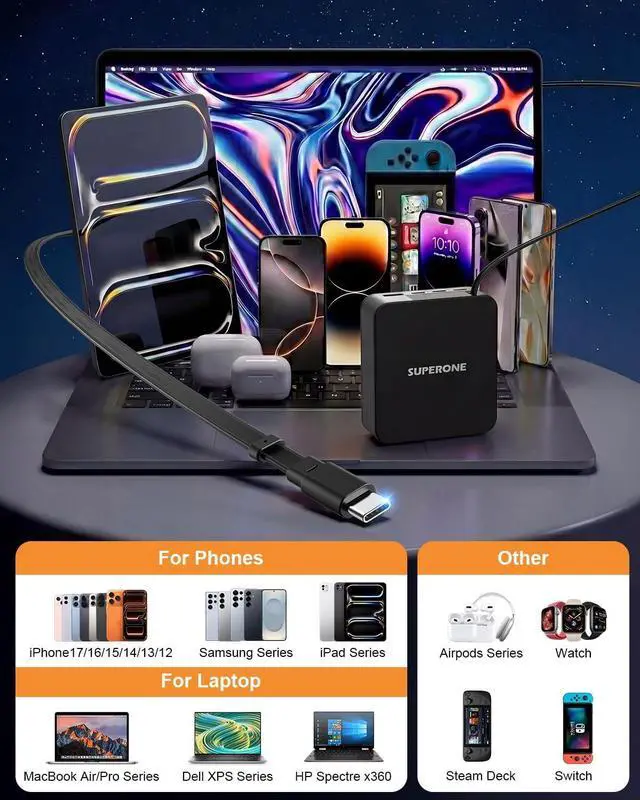 Unparalleled Compatibility: This retractable usbc charger features a retractable USB-C cable, USB-C and USB-A ports, making it compatible with virtually all electronic devices. It can fast charge laptops such as Macbook, Galaxy Book, Lenovo Idea Pad, ASUS Vivobook, HP Chromebook, Google Pixelbook, and Dell XPS, and is also compatible with iPhone 17/16/15/14/13/12/11, Samsung Galaxy S25/S24/23/22/21, iPad, and other digital devices.