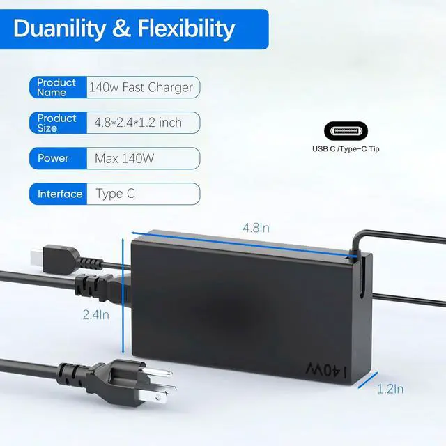 Fast Charging with Universal USB-C Power: The full potential of USB-C Power Delivery . With a robust 140W (20V/7A) output, it charges compatible laptops rapidly, significantly reducing downtime. The single USB-C port provides a modern charging solution.