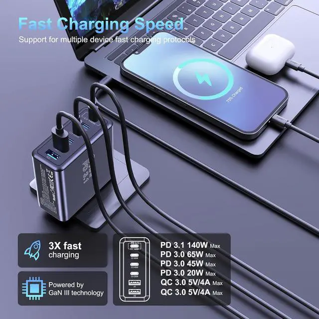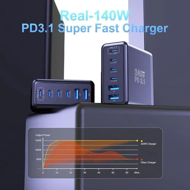 6 in 1 Multiport Charging: 4 USB C ports and 2 USB A ports power two laptops and four phone simultaneously, fast enough for a multi device tech user. If charge two laptops at the same time, the output power of USB C1 is 140W, and the output power of USB C2 is 65W. What's more is that this 6-port usb c power adapter can help you to keepping your desktop tidy