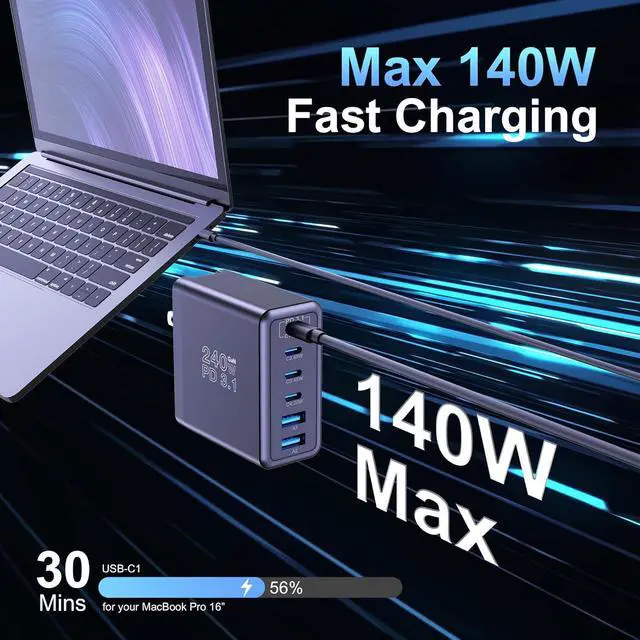 PD 3.1 Super Fast Charging: This Graaci 240W laptop charger is integrating the latest PD3.1 protocol and 140W fast charging, it can fast-charge your MacBook Pro 16" from 0% to 56% in only 30 minutes, and must use its original charging cable, not included in the package