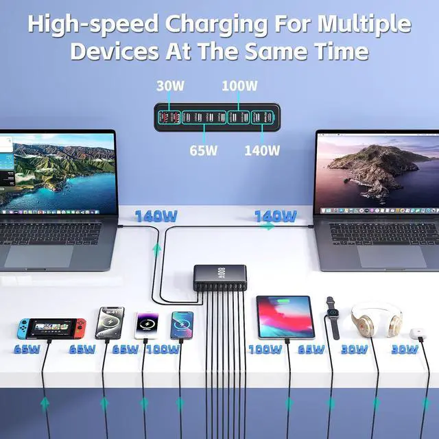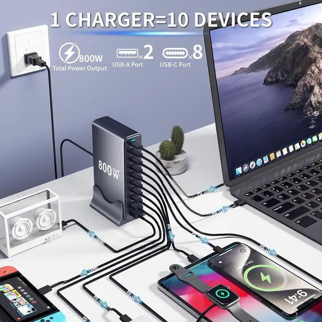 Ultimate 800W Multi Charging Station for Home & Office Engineered as the ultimate multi charging station and desk charger, this powerhouse delivers 800W total power through 10 ports. It effortlessly charges laptops, iPhone charger fast charging, and multiple devices simultaneously, eliminating the clutter of traditional charging blocks and keeping your workspace fully powered and organized.