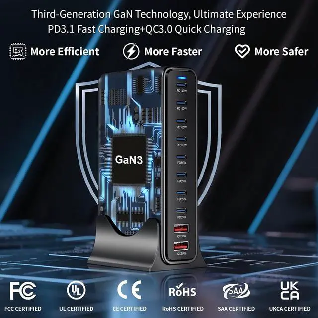 Dual 140W Pro-Level Apple Charger Performance With its Dual 140W PD ports, this Apple charger delivers professional-grade power for MacBook Pro and other demanding devices. Experience rapid iPhone charger fast charging capabilities even while charging multiple devices simultaneously from this versatile desk charger.