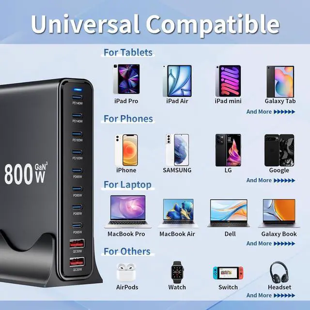Complete Universal Charging Solution for All Devices As a true universal travel adapter and phone charger, it offers seamless compatibility across all your gear. This versatile charging adapter works flawlessly with iPhones, Galaxy phones, iPads, MacBooks, gaming consoles, and moremaking it the single multi charging station solution for every device in your life.