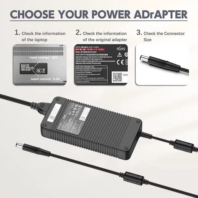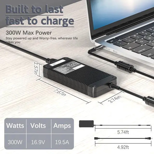 SpecificationInput:100-240V, 50-60Hz ; Output:19.5V, 16.9A, 330W ; Connector size:7.4*5.0mm Charger
