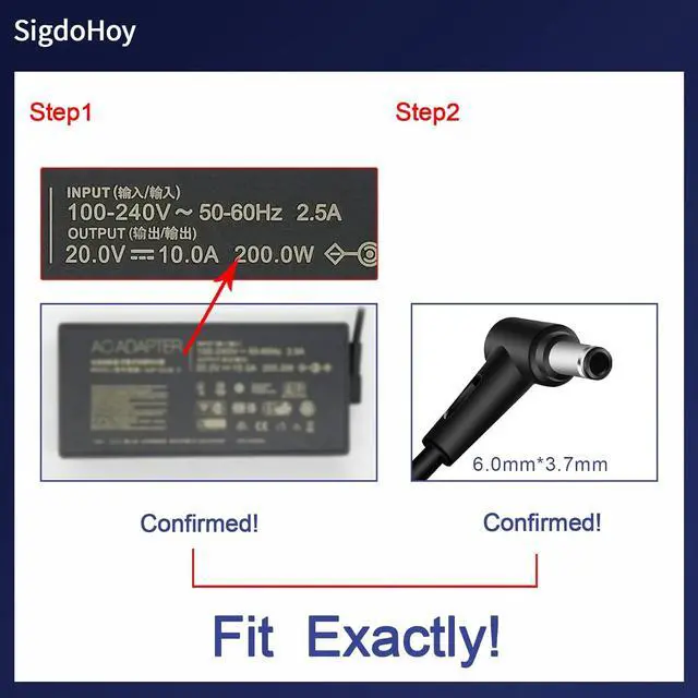 Output:20V 10A 200W; Input: 100-240V 50-60Hz; Connector Size:6.0*3.7mm[Do not buy if your laptop requires more than 200W].