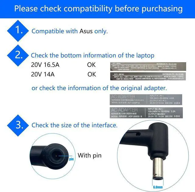 AC Input Voltage: 100-240V 50-60Hz DC Output: 20V 16.5A (Compatible with 20V 14A) Output Power: 330W (Compatible with 280W) Connector: 6.0mm*3.7mm (With pin, cant replace Rectangle Tip charger)