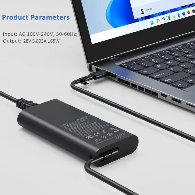 Output Voltage : 28V 5.893A 165W MAX (Work with 130W 100W 90W 65W 45W usb c laptop), Input Voltage: 100-240V, 50-60Hz. Power Connector Type: USB-C.