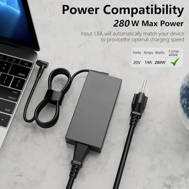 Input: 100-240V 50-60Hz; Output: 20V 14A 280W Max (also Works for 240W 230W 200W 180W 150W Wattage Devices) Connector Type: 6.3mm*3.7mmNot suitable for laptop devices with power exceeding 280W)