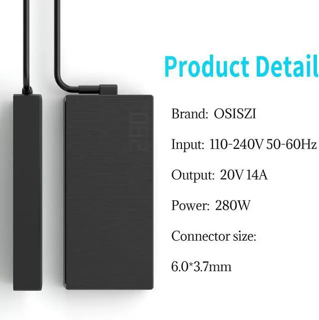 Product POWER MAX : 280W, AC Input: 100 - 240V 50 - 60Hz, Output: DC 14A 20V 280W,Connector size: 6.0*3.7mm,Warm tip If the charger dont work Please clean dust or other obstacles inside of the your devices then reconnect the charger, so as to make a good contact"