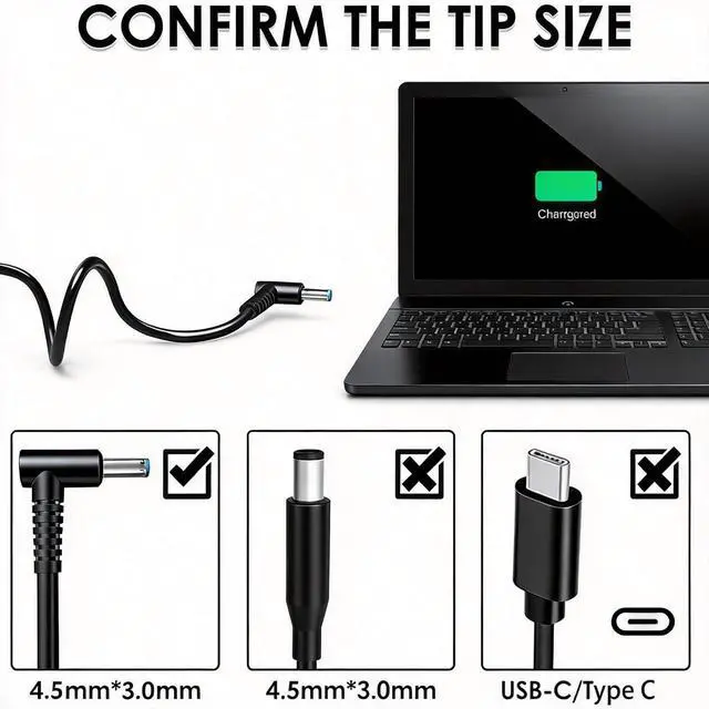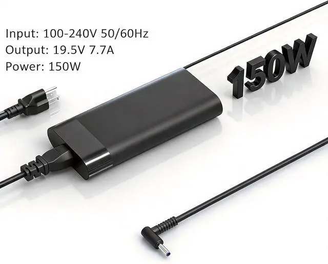 Bullet Point 1 (Specs & Connector): Exact power specifications; Output 19.5V 7.7A 150W; Input 100-240V; Features the essential 4.5mm x 3.0mm blue tip connector with central smart pin; Please physically verify your laptop charging port matches this exact tip size before purchase