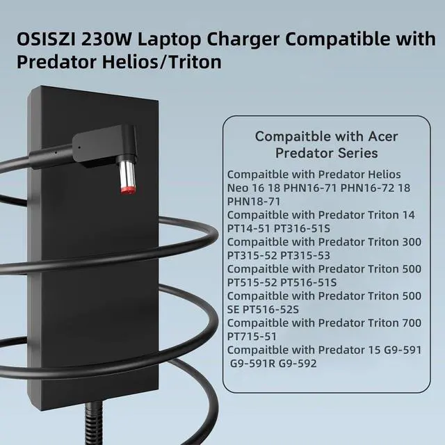 OSISZI 230W AC Charger Compatible with Acer predator helios 300/neo 16 charger.Helios 500 (PH315-53/54, PH517-51/61), Triton 300/500 (PT515/516-51s), and Nitro 5/17 (AN16/17-51/71). Precision-matched to replace OEM charger without performance loss.