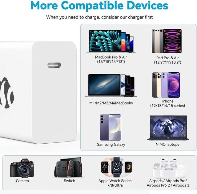 Wide Compatibility: The laptop charger is compatible with a wide range of devices, including MacBook Pro & Air (16", 15", 14", 13"), M1, M2, M3, M4 MacBooks, iPad Pro & Air (12.9", 11", 10.9"), iPhone (12, 13, 14, 15 series), Samsung Galaxy, NIMO laptops, and all USB-C devices. Automatic power detection optimizes charging for all your devices.
