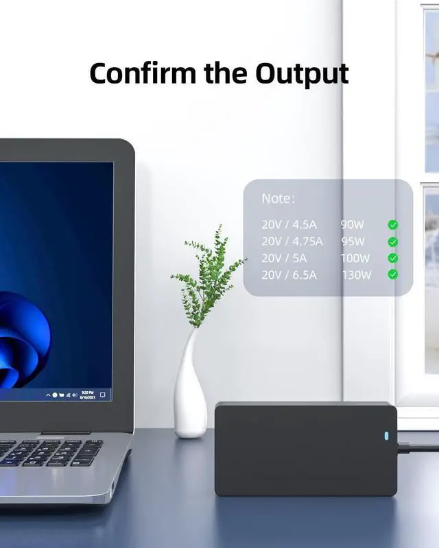 Input: 100-240V 50-60Hz Output: 5V/9V/15V/20V 1A/6.5A Watts: 130 Watts