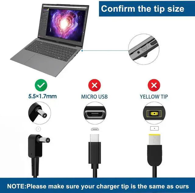 AC input voltage: 100 ~ 240V 50 ~ 60 Hz 4.5A, DC output: 19.5V ~ 16.92A 330W. Connector size: 5.5*1.7mm black tip
