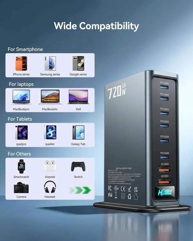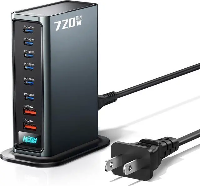 High-Power 720W Multi-Port USB-C/A Charging Station: Experience the ultimate charging solution with our 720W high-power charging station, designed to handle multiple devices simultaneously. This versatile charging hub features both 6 USB-C and 2 USB-A ports(2 140W USB-C ports, 4 100W USB-C ports and 2 20W USB-A ports), ensuring compatibility with a wide range of gadgets. Whether you're charging your MacBook, smartphone, tablet, or other USB-powered devices, this charging station has got you covered. With its powerful output, You can charge multiple devices simultaneously without waiting.