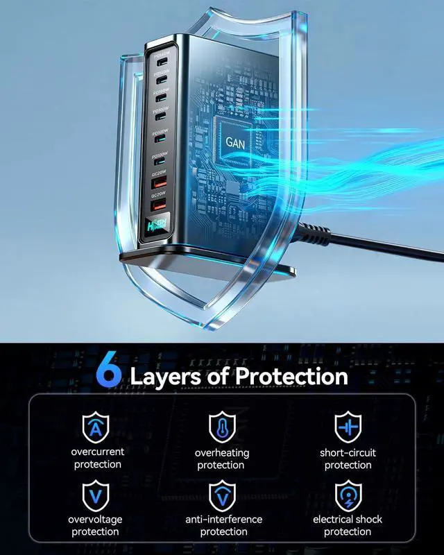 Safe and Reliable Charging Solution: The USB C charging station uses high-quality GaN chip technology, your safety is our top priority, which is why our charging station is equipped with multiple safety features to protect you and your devices. The built-in overcurrent, overvoltage, and short-circuit protection ensure that your gadgets are charged safely and efficiently, preventing any potential damage. Additionally, the fire-resistant material used in construction provides an extra layer of security, giving you peace of mind while charging.
