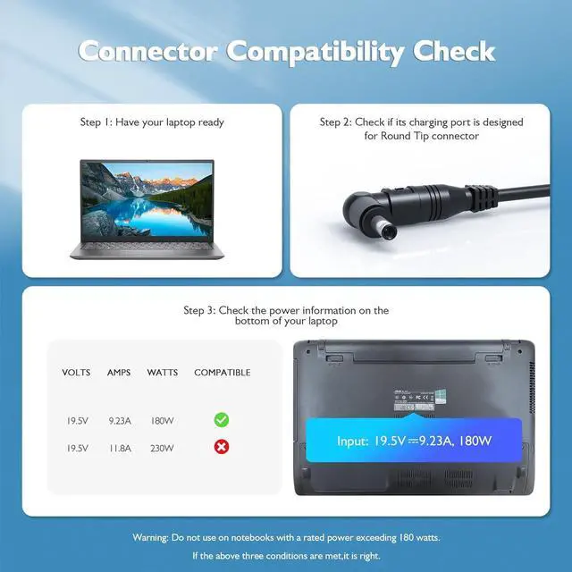 Specifics: Output Max - 180W, 19.5V 9.23A, compatible with 150W and 120W, Input Range - 100 - 240V