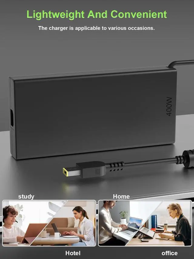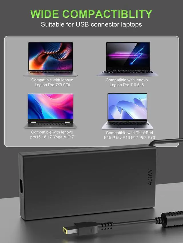 CompatibilityThis 400W power adapter is fully compatible with Lenovo's mainstream product lines, including Lenovo Legion Pro 7 7i 9i (Gen 10 16 18) (16IAX10H 16AFR10H). It is also compatible with Lenovo laptops equipped with 330W and 300W power supplies. (Note: Please ensure your connector type is Yellow Slim Tip before purchasing.) If your model requires 20V/20A output,(replacement part numbers: ADL400SDC3A ADL400SCC3A SA11Q29118 ) this well-designed adapter is ideal.