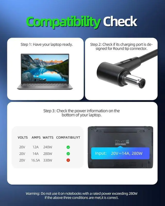 Output Max - 20V 14A 280W, compatible with 20V 12A 240W Input Volt Range - 100-240V