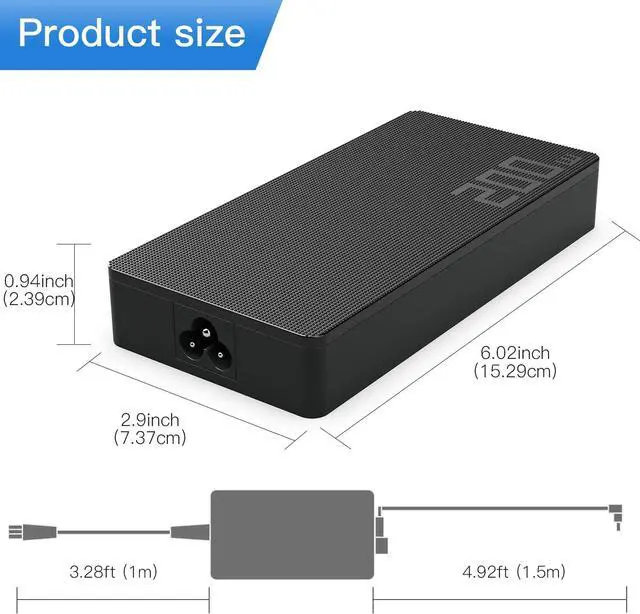 Connector Size: Rectangle Conn (as shown in the picture). Please note that it is not compatible with 6.0*3.7mm connector. Input: 100-240V 50-60Hz, Output: 20V 10A 200W