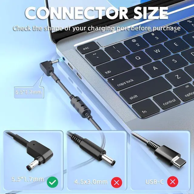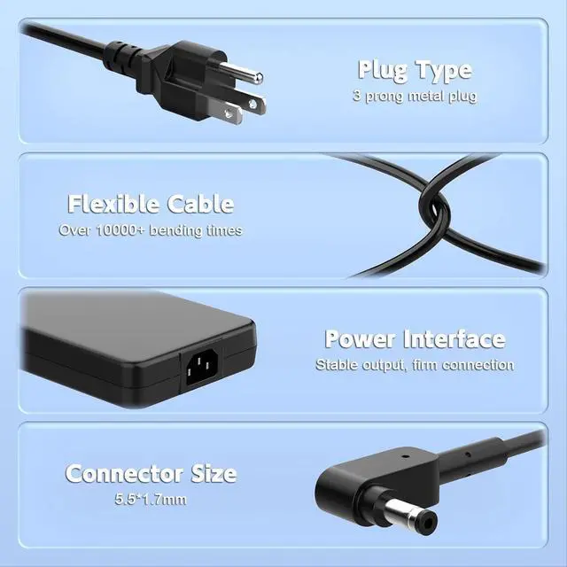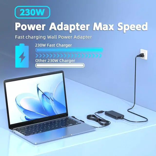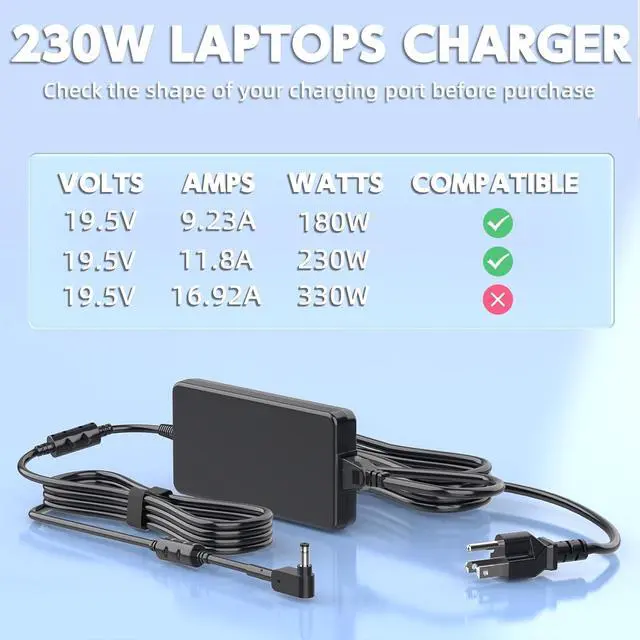 Power Specs: Output: 19.5V 11.8A 230W (Compatible with 135W 19V 7.1A, 180W 19V 9.23A); Input: 100-240V 50-60Hz; Connector Size:5.5*1.7mm(Not fit for 330W)