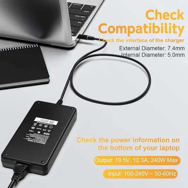 Output: 19.5V, 12.3A, 240W (Also Compatible With 9.23A, 180W); Input: 100-240V ~ 50/60Hz. Connector Size: 7.4mm*5.0mm.