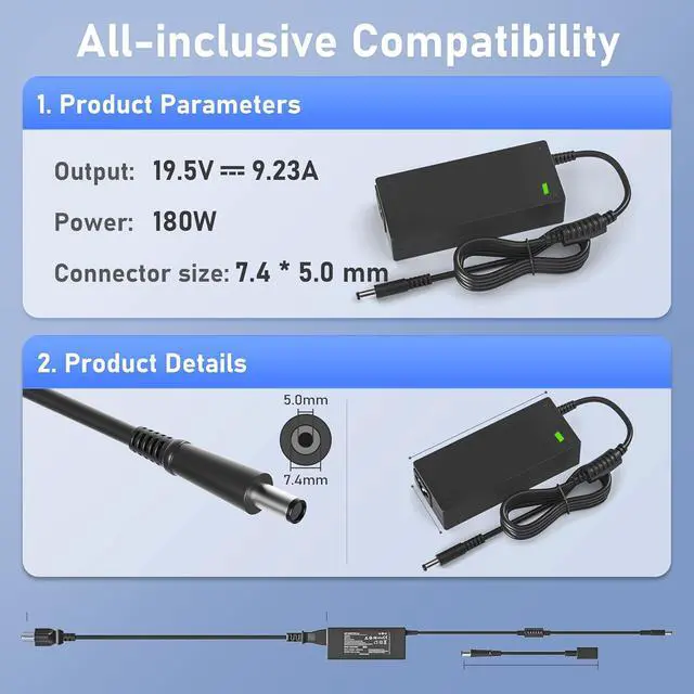Input 100-240V 50-60Hz Output:19.5V-9.23A 180W Watts (Aslo Compatible With 19.5V 6.7A 130W Watts docking station) Connector Size: 7.4mm X 5.0mm. Package Contents: 1 x emaks power adapter, 1 x high-quality AC cable1 x manual