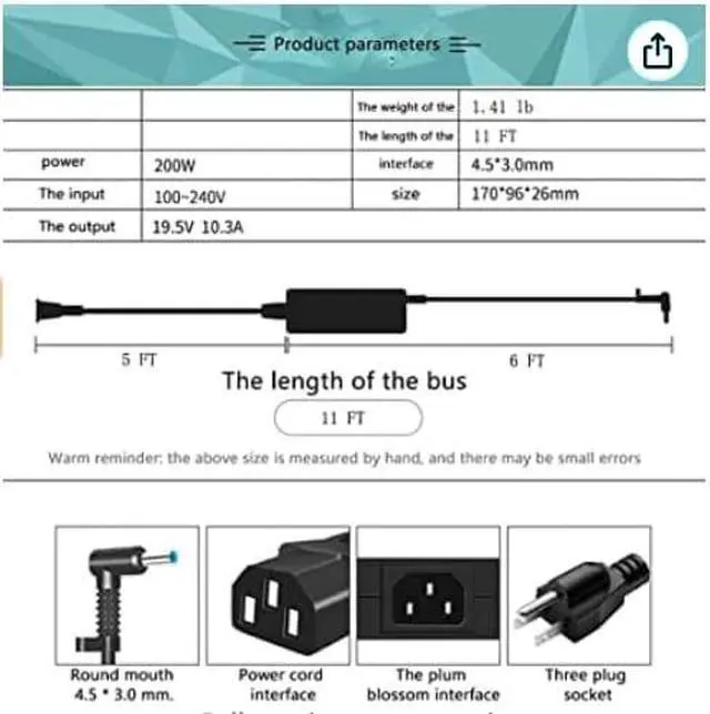 Input Voltage: AC100-240V, Output Voltage:19.5V,Output current:10.3A,Total output power:200W,DC pin sizes:4.5 x 3.0mm,please make sure the output and DC pin sizes is correct for you.