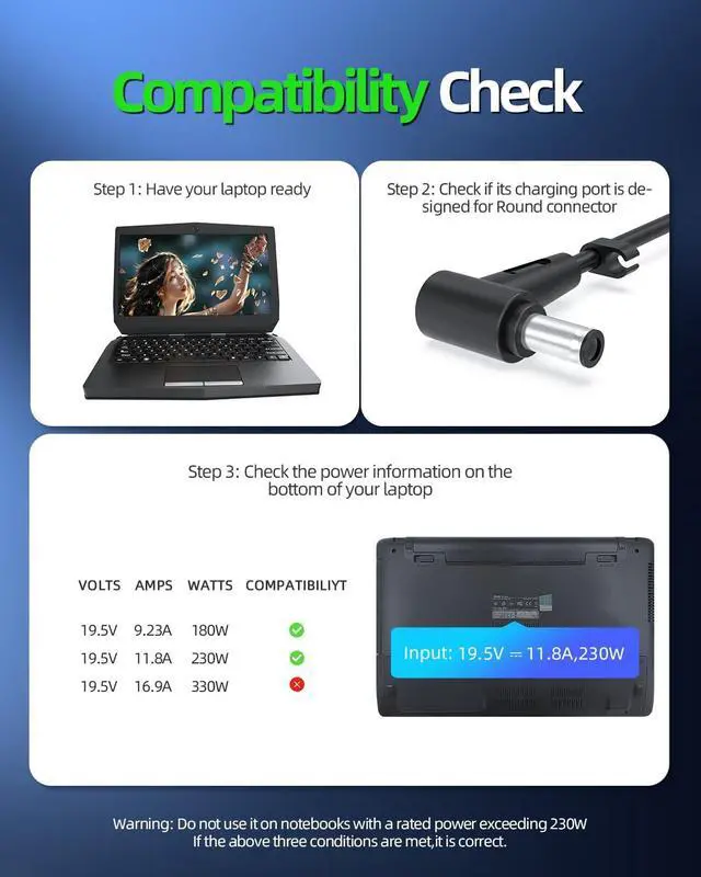 Output Max - 19.5V 11.8A 230W, compatible with 19.5V 9.23A 180W Input Volt Range - 100-240V