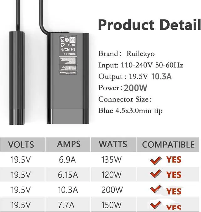 Premium Quality for Long-Lasting Use Crafted with a durable 4.5*3.0mm blue tip connector, this 200w laptop charger offers consistent performance and longevity.