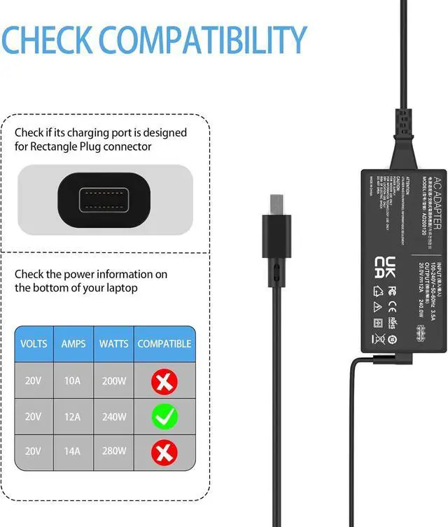Input : 100-240V 50-60Hz, Output: 20V 12A, Watt: 240W Also Compatible with 200W 180W,Connector: Rectangle Plug (Compact Plug)