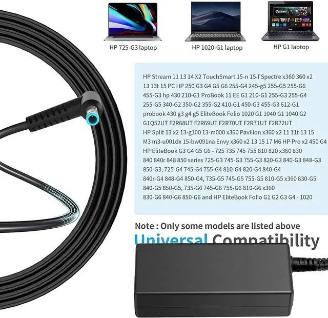 SPECIFICATIONSInput: AC 100-240V, 56/60Hz; Output: 19.5V 2.31A 45W; Connector Size: 4.5mm * 3.0mm (Blue Tip) for HP Laptop Charger Power Supply AC Adapter Cord Replacement. Note: Compatible with 45W HP Laptop.we provide a 12-month warranty, 30-day return and exchange service.Compatible Models: (use "ctrl+F" to find your model quickly)