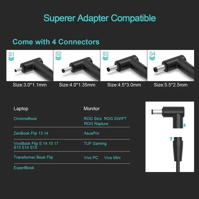 Fit for Asus PA-1330-39, ADP45W, ADP-65DW, ADP-40KD, ADP-45HE, SADP-65KB, SADP-65NB Asus 0A001-00330100, 0A001-00340200, 010HLF AD883J20, 010H-3LF, AD883220, AD883020, EXA1206CH, ADP-45BW B, ADP-65AW A, ADP-65JH BB, EXA0703YH, ADP-65GD B, EXA1203YH, EXA1204YH, PA-1650-78, 04G268002900, 04G268003000, 04G268003100, 04G268003200, 04G268003300, 0A001-00041500, 0A001-00330200, 0A001-00441500, 0A001-00600100, AD890326, AD890528, ADP-33AW, ADP-33AW A, EXA1206EH, EXA1206UH, 90-XB34N0PW00000Y, ADP-45AW, N45W-01, AD883320, AD883520, AD883P20, 010HLF BAH, 010KLF BAH, 010HLFBAH, 010KLFBAH, 90-XB3NN0PW00010Y, 0A001-00230300-0A200-00021900, ADP-45AW A, ADP-45AW C, 0A001-00040500, PA-1650-93, PA-1900-36, PA-1900-42, 90XB00BN-MPW010, N65W-03 Model