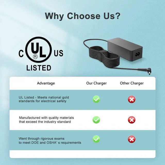 UL Listed Products - the product has successfully met stringent requirements. Don't buy potentially inferior or dangerous chargers that can harm your laptop or worse!