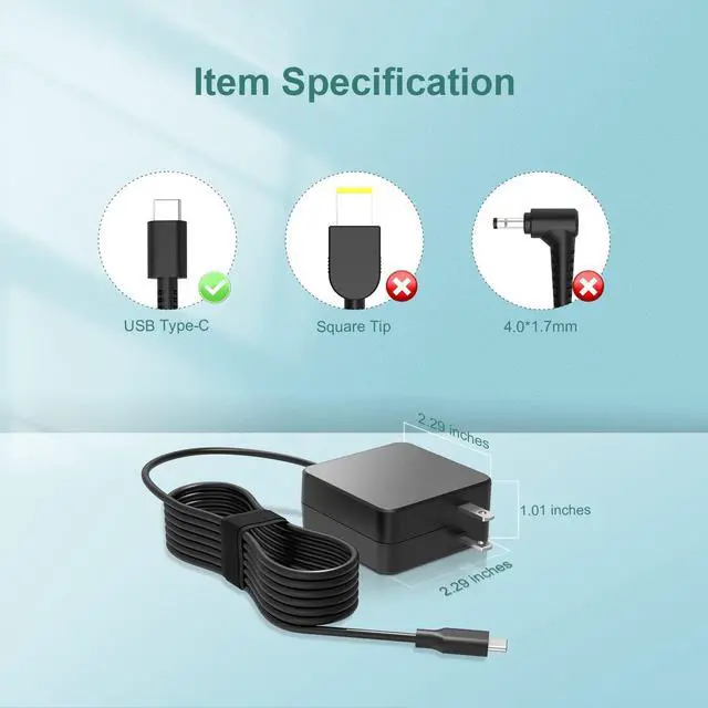Power Specs: USB Type-C Connector (Not Square Tip Connector). Output: 45W, 20V-2.25A. Input:100-240V 50-60Hz.