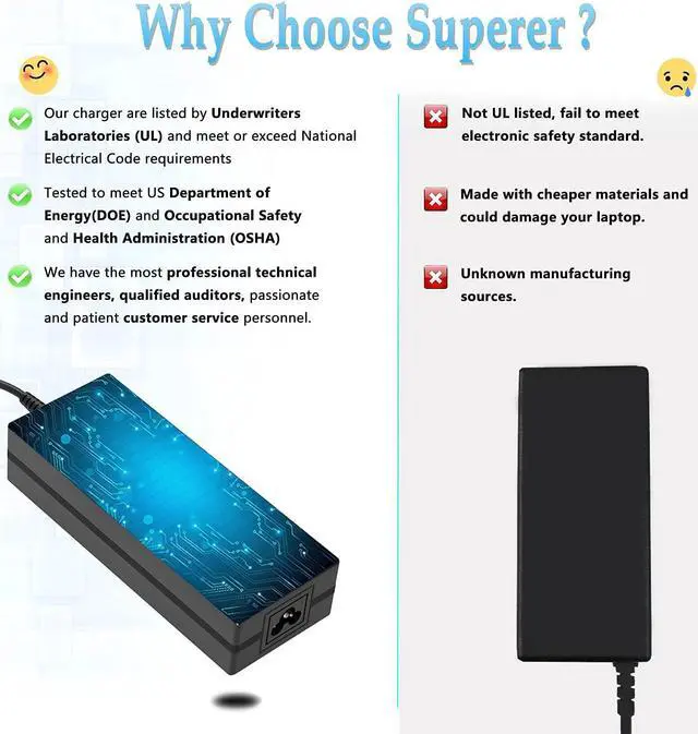 Safety / UL Listed: Our products are tested, approved and certified by ul, manufactured with the highest quality materials,please remember not to buy a charger that is inferior and will damage your laptop.